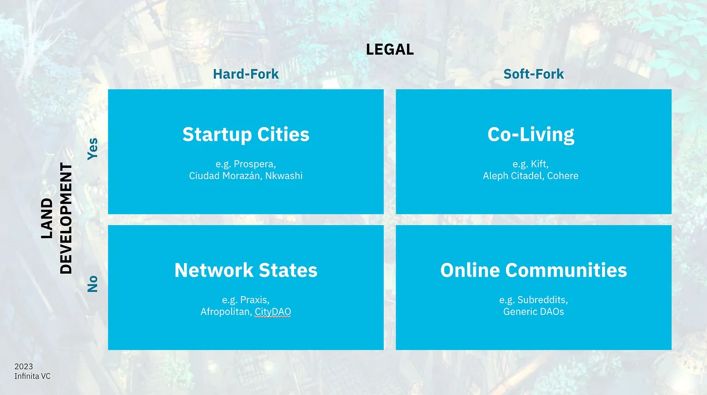 Projects that focus on physical territories can be classified based on their level of autonomy and legal innovation. Does the project seek to experiment with new forms of regulation, taxation, or governance models? If so, it likely falls somewhere within the Startup Cities Quadrant. Próspera is the most well-known example..