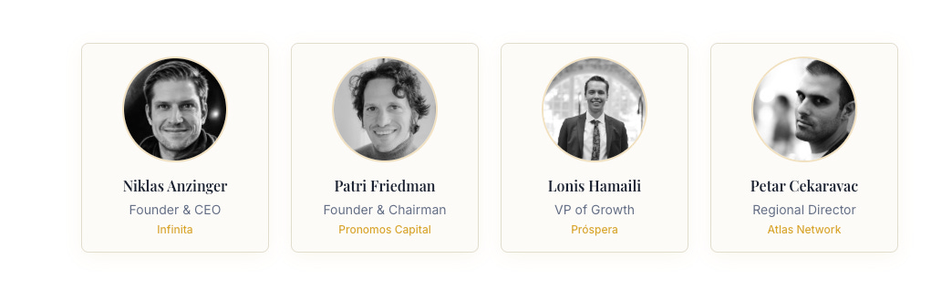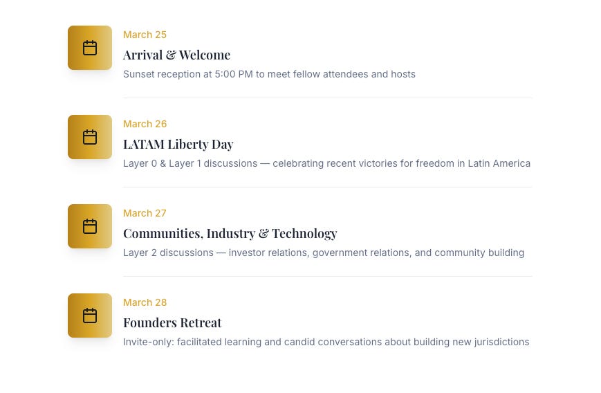The Founders Retreat is an approval-only track for people actually building new jurisdictions, governance infrastructure, or on top of those new layers. The group will be joined by Pronomos Capital GP and Seasteading legend Patri Friedman, and a group of aligned VCs & private investors and other practitioners for orientation sessions, small-group problem-solving, and candid conversations about regulation, financing, and execution. No pitches or posturing, this is where you’ll hear the real war stories and practical help on what to do next, all off the record.
