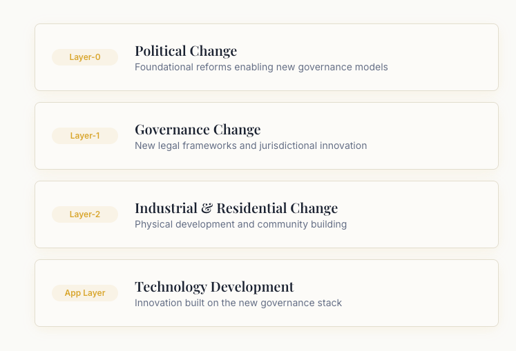 The summit has a specific thesis of change: governments (layer-0) need enabling legislation for limited institutional change, allowing special economic zone or other forms of localized governance autonomy (layer-1). These local governance providers then need to attract and develop industry clusters (layer-2) that can lead to the formation of more than standard manufacturing industrial parks, but leapfrog to the “app layer” frontiers of technology (e.g. biomedical, finance, hardtech) and form residential communities, incl. experimentation in self-governance.
