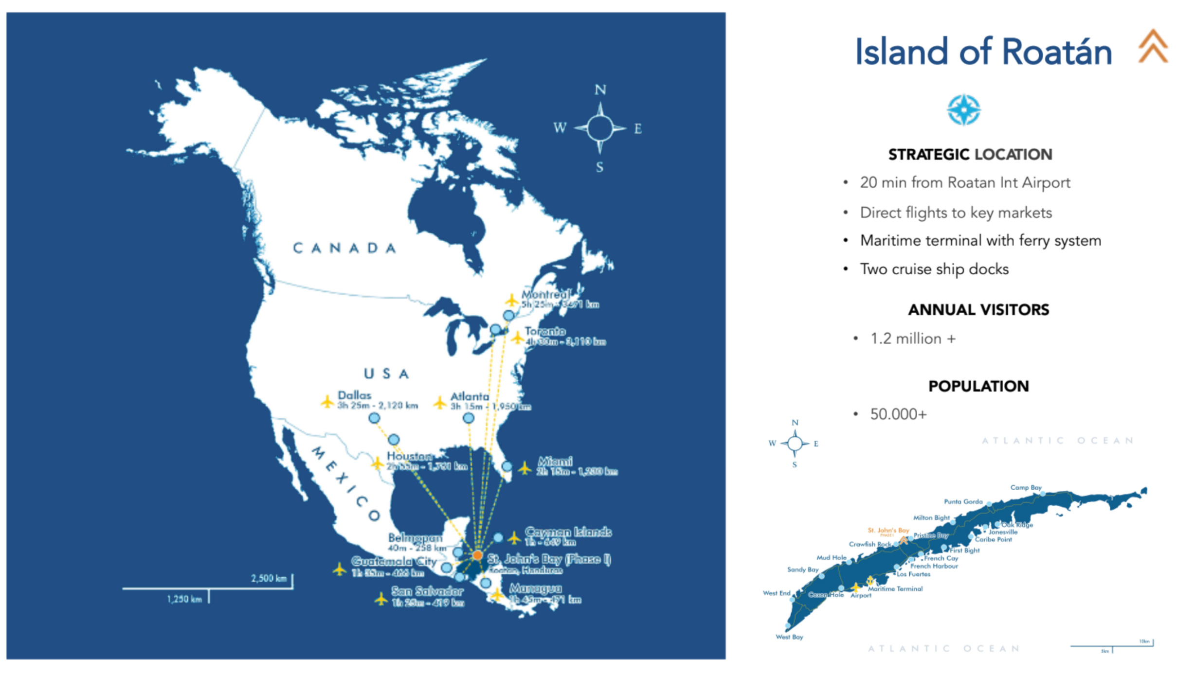 Próspera is building a private city located in Roatán*, a Caribbean island about 65 kilometers off the northern coast of Honduras.