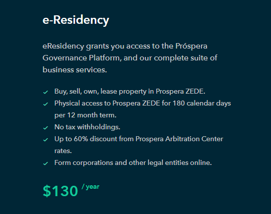 1. Virtual e-residency: This tier provides you physical access to Próspera for 180 calendar days per 12 months. Additionally, it allows you to purchase property and establish corporations and other legal entities. All online.
