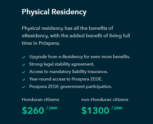 2. Full Residency: This is for those who want to reside in Próspera (semi-) permanently. The cost for foreigners is $1,300 per year, for Hondurans, it is $260.