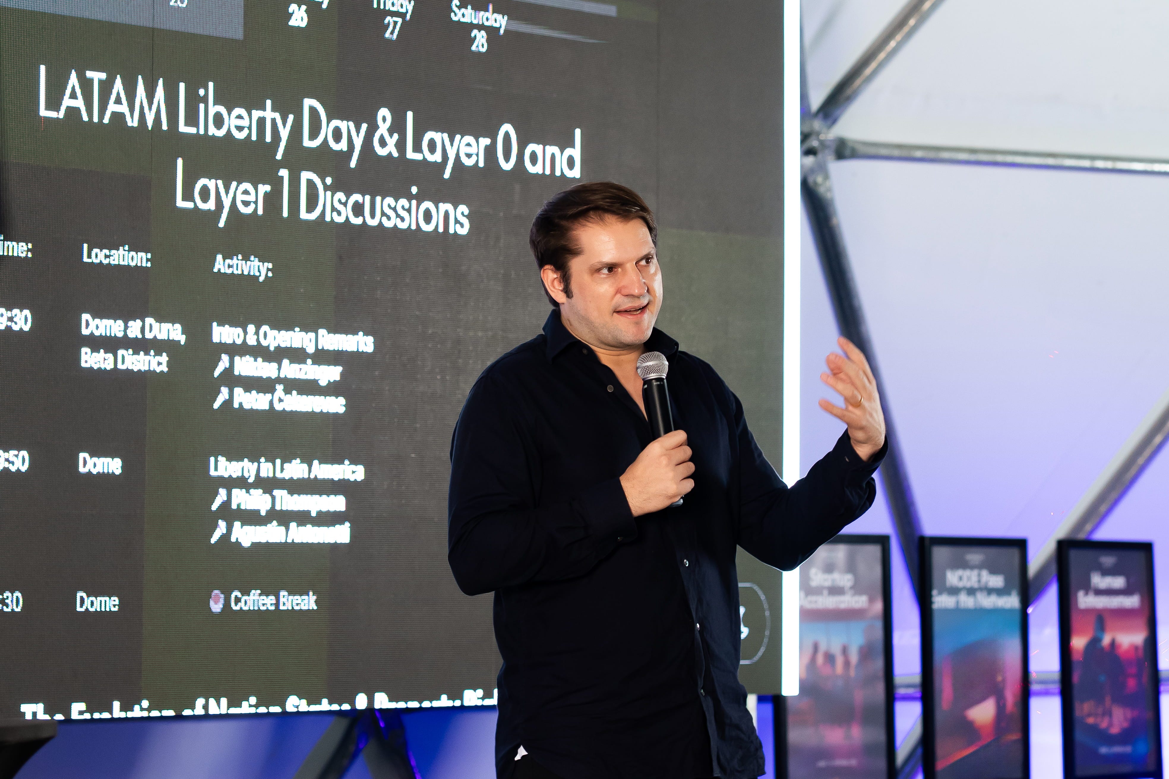 At the Layer-0 level, voices shaping political and ideological direction: Agustin Antonetti (a major Argentinian influencer close to the Milei government), Philipp Thompson (who has worked with Peruvian president Hernando de Soto, author of “The Mystery of Capital”), Patri Friedman (focused on governance experimentation and new jurisdiction models), Mark Frazier (on partnership models between governments and new systems), and Tomas Pueyo (with a talk on geopolitical shifts driven by technology).