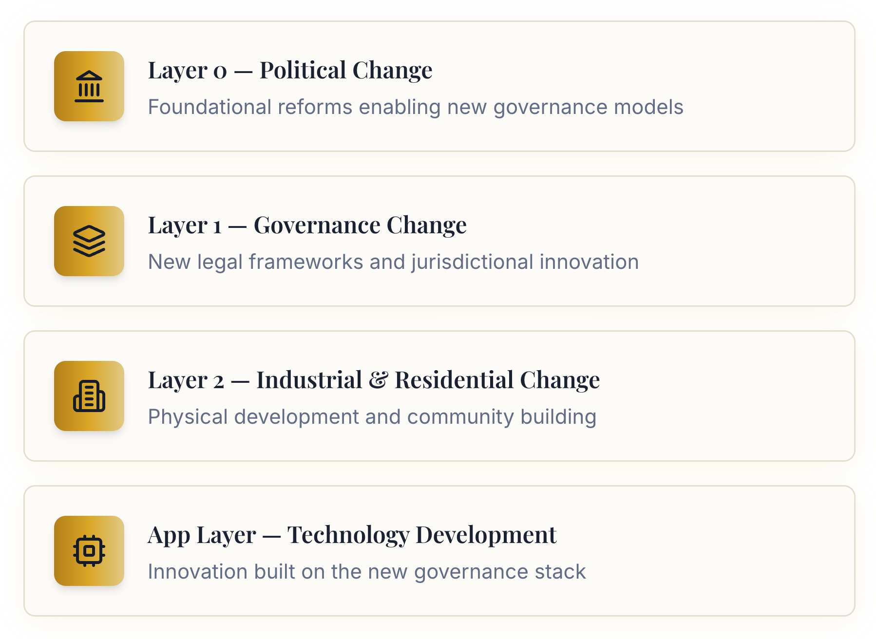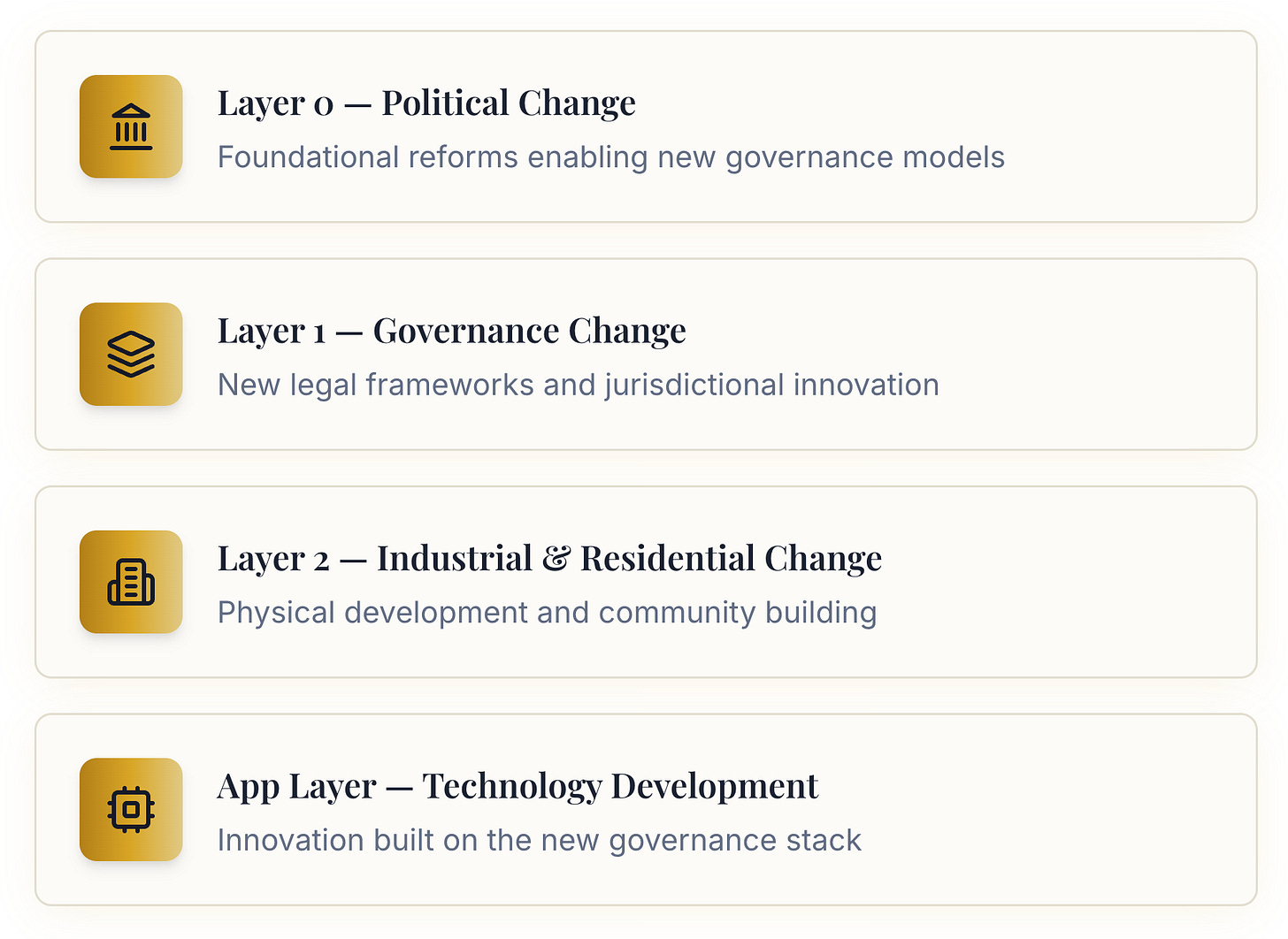 The core idea is enabling “Layer-1” change: governance decentralization through special jurisdictions with legal autonomy. This is what makes charter cities possible, and what creates the base layer for what many refer to as network societies.
