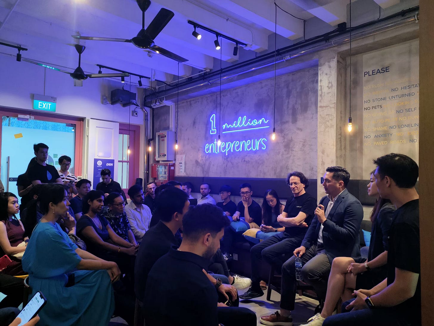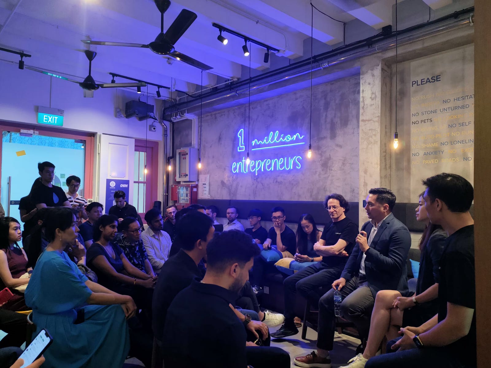 The Singapore house is a mix of workspace, digital innovation studio, and founder hangout. Under the neon sign “1 million entrepreneurs”, people come through to share deals, ideas, and late-night conversations.